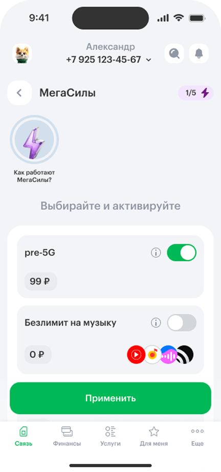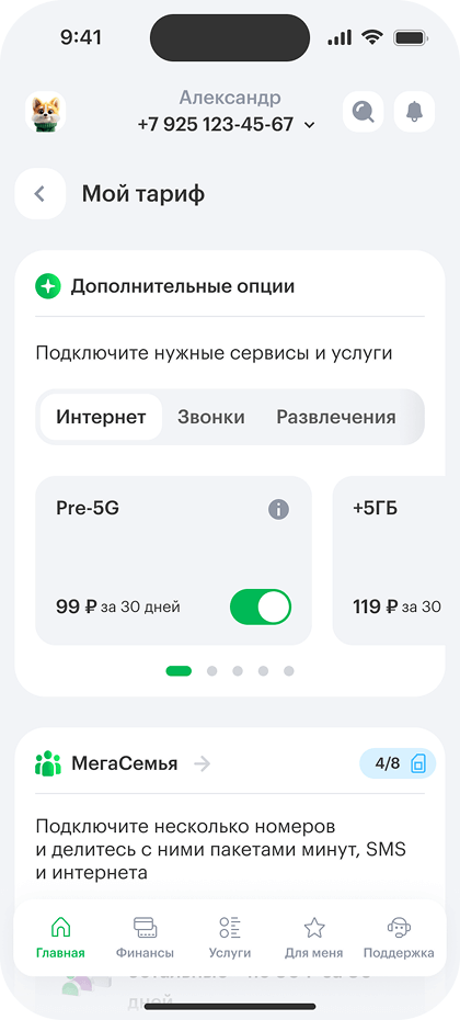 - 3Если у вас уже активированы все доступные на тарифе МегаСилы или опции нет в списке, то подключите pre‑5G в разделе «Мой тариф» → Дополнительные опции.